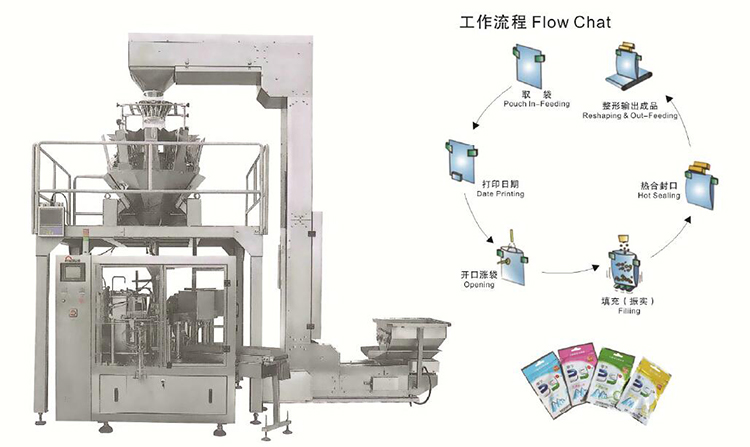 Suitable for candy, hard nut, raisin, peanut, melon seeds, chips, chocolate, biscuit, hardwards and Other stOI dsautOmatjcweighing packages.